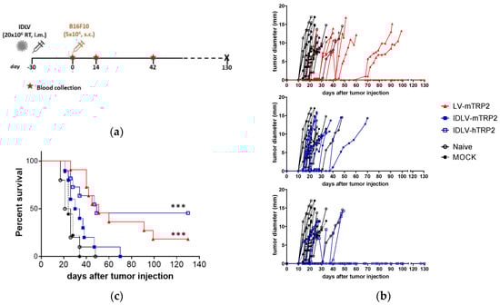 Groups of 9–11 mice were i.m. immunized once with high dose of IDLVs expressing either human or murine TRP2, according to the scheme depicted in Figure 7a. LV-mTRP2 was used as a positive control, while IDLV-OVA (Mock) and Naïve mice were included as negative controls for immunization and for tumor growth. Blood samples were collected at the day of tumor injection (day 0, corresponding to 30 days after immunization), at 14 and 42 days after tumor injection.