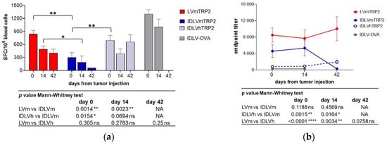 Kinetics of TRP2-specific immune responses in mice immunized with IDLV delivering either murine or human TRP2 and challenged with B16F10 tumor. C57BL/6 mice (n = 9–11) immunized with vectors expressing TRP2, OVA, or left untreated were s.c. injected with 5 × 104 B16F10 cells/mouse after 30 days from immunization, as depicted in Figure 7a. (a) TRP2-specific T cell response was evaluated by IFNγ ELISPOT, measured at different time points in blood. Cells were collected and stimulated with H-2Kb restricted TRP2 9mer peptide (SVYDFFVWL). Data are expressed as mean spot forming cells (SFC) per 106 cells, bars represent standard error among animals from the same group. (b) Anti-mTRP2 IgG antibodies were analyzed in plasma of immunized animals by ELISA. Data are expressed as mean of endpoint titers and bars represent standard error among animals from the same group. Comparison among groups was evaluated using the Mann–Whitney test, as indicated by p values shown in the tables under the graphs. * p < 0.05; ** p < 0.01; **** p < 0.0001. NA: The comparison was not performed since only one animal from IDLVmTRP2 group was alive at day 42.