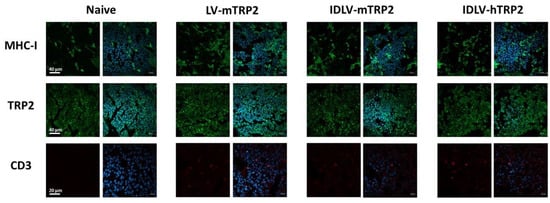 Confocal laser scanning microscopy (CLSM) analyses on mice tissue sections. Representative images of tumor from naïve, LV-mTRP2, IDLV-mTRP2, and IDLV-hTRP2 mice are shown. Tissue sections 8 µm thick were stained for MHC–I (green), TRP2 (green), or CD3 (red) as indicated (left columns) and for DAPI as nuclear staining (blue, right columns). Images represent a 3D reconstruction of 30–40 single Z-stack. Results from one representative experiment are shown for each analysis. Scale bars are indicated.