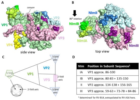 Protomer structure of RV-A16 and neutralising sites for Abs. Coordinates for RV-A16 protomer structure (1AYM) were downloaded from the protein data bank at www.rcsb.org and images created using PyMol molecular graphics system version 2.3.2 (Schrodinger LLC). (A,B) shows the protomer structure with VP1 (green), VP2 (light blue), VP3 (pink), and VP4 (yellow). Neutralising immunogenic (NIm) regions are highlighted light green (NIm-IA), lime green (NIm-IB), blue (NIm-II), and purple (NIm-III). The canyon region is identified in the side view shown in (A). (C) Schematic diagram of the RV capsid protomer showing approximate locations of the VP1, VP2 and VP3 subunits and the three axes of symmetry, including their position within the RV capsid icosahedron (smaller inset). (D) Location of NIm sites within each capsid protein subunit of RV-A16. Numbering refers to each individual capsid subunit amino acid sequence. NIm-IA is the only known linear sequence whereas the remaining NIms are discontinuous epitopes.