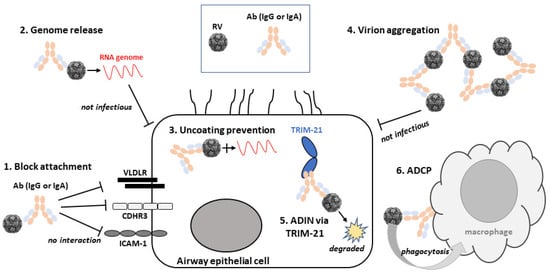 We identified at least six potential mechanisms of Ab neutralisation or clearance for RVs as discussed. These range from steric hindrance of entry receptor engagement to Ab-induced structural changes or stabilisation of capsid structure that can influence uncoating mechanisms or adsorption to cells. Many of these observations were originally identified from analyses performed in vitro with purified Abs and could be expected to not fully reflect situations where Abs function in vivo—thus we included as a 6th mechanism the engagement of phagocytic cells through Ab Fc regions. Importantly, these Abs performing ADCP were probably dismissed previously as non-neutralising Abs but in light of new observations should be considered in the context of clearance of RV in vivo.