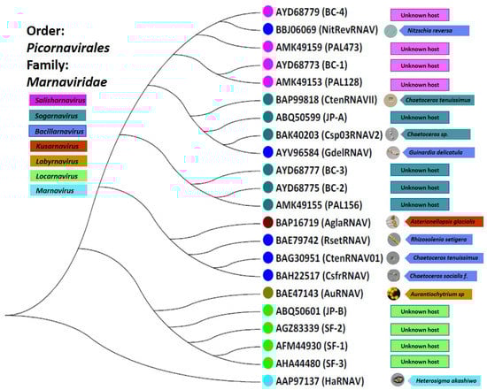 The Picornavirales order unites small, non-enveloped viruses that infect eukaryotes and possess a number of prominent features. Members of this order are +ssRNA viruses with a genome length between 7.2 and 9.8 kb. They have an icosahedral virion (approximately 30 nm in size) that has a pseudo T = 3 architecture. All members of the order Picornavirales contain a Hel–Pro–Pol (Helicase, Protease and RdRp) replication block [72]. Members of the order Picornavirales are known to be able to infect a wide range of species, including vertebrates (birds, fish, amphibians, reptiles, and mammals), invertebrates (insects), microalgae, human beings, and plants [72]. Picornaviruses are associated with a mild, severe, and lethal range of human diseases such as aseptic meningitis, encephalitis, the common cold, febrile rash illnesses, conjunctivitis, herpangina, myositis and myocarditis, and hepatitis. Prior to the metagenomic discovery of 4500 distinct RNA viruses [42], we analyzed the conserved RdRp domains’ amino acid sequences of the 10 isolates and 12 metagenomically assembled genomes of +ssRNA viruses related to the order Picornavirales which are presented in Table 1. The sequence-based taxonomy for the order Picornavirales in connection with their protist hosts is presented in Figure 1. Currently, the order Picornavirales includes the families Dicistroviridae, Iflaviridae, Marnaviridae, Picornaviridae, Polycipiviridae, Secoviridae Caliciviridae, and Solinviviridae, [73,74]. Recently, all protist picorna-like viruses were joined to the family Marnaviridae which includes seven genera: Labyrnavirus, Bacillarnavirus, Marnavirus, Locarnavirus, Kusarnavirus, Salisharnavirus, and Sogarnavirus [28]. However, it is clear that this group requires a taxonomic reorganization based on new data [42].