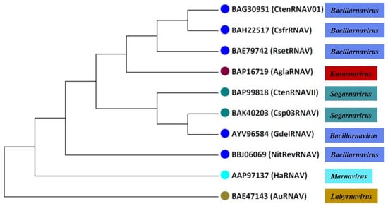 Csp03RNAV, a member of the genus Sogarnavirus that causes the lysis of the marine planktonic diatom Chaetoceros sp. strain SS08-C03, was isolated from surface waters of the Yatsushiro Sea, Japan [64]. This virion is icosahedral and 32 nm in diameter, and its assembly takes place in the cytoplasm of the host cells. The latent period was estimated to be <48 h. The Csp03RNAV genome of 9417 bases encodes two ORFs, one of which codes for putative replication-related proteins and the other for putative structural proteins (Table 1). Csp03RNAV expressed three major polypeptides at 42.0, 34.0, and 28.0 kDa [64]. The monophyly of Csp03RNAV and the other known diatom-infecting ssRNA viruses (genus Bacillarnavirus), Rhizosolenia setigera RNA virus, Chaetoceros socialis f. radians RNA virus, and Chaetoceros tenuissimus RNA virus is supported by phylogenetic analysis based on the amino acid sequence of the conserved RdRp domain [64].
