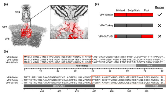 Chimeric simian/turkey VP4. (a) Schematic representation of the crystal structure of the rotavirus outer capsid layer based on PDB 4V7Q. The amino acid residues located in cavity formed by VP6 and VP7 are shown in red. (b) Amino acid sequence alignment of VP4 from simian SA11 (VP4-Simian) and turkey 2E10 (VP4-Turkey) in comparison to the sequence of the chimeric VP4 construct (VP4-Si-Tu-Si). The red boxes correspond to the amino acid residues shown in red in (a). (c) Schematic representation of VP4-encoding genome segments used for rescue experiments. N/Head: N-terminus and head region, VP4-Simian: red, VP4-Turkey: dark gray.