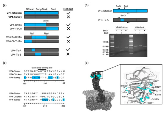 Chimeric chicken/turkey VP4. (a) Chimeric VP4-encoding genome segments used for rescue experiments. N/Head: N-terminus and head region, VP4-Chicken: blue, VP4-Turkey: dark gray. (b) Agarose gel analysis of a restriction enzyme digestion of RT-PCR products from VP4-Chicken and VP4-Tu-A. The primer-binding sites and restriction enzyme sites are indicated. (c) Amino acid sequence alignment of the C-terminal part of the VP4 head region. The amino acid residues in VP4-Tu-A that were substituted with the corresponding residues of VP4-Chicken are highlighted in blue. The black line indicates the position of a known sialic acid-binding site for simian RRV [38]. (d) Location of amino acid substitutions (highlighted in cyan) present in the head region of VP4-Tu-A as projected into the 3D structure of simian RRV VP4 (PDB 4V7Q).