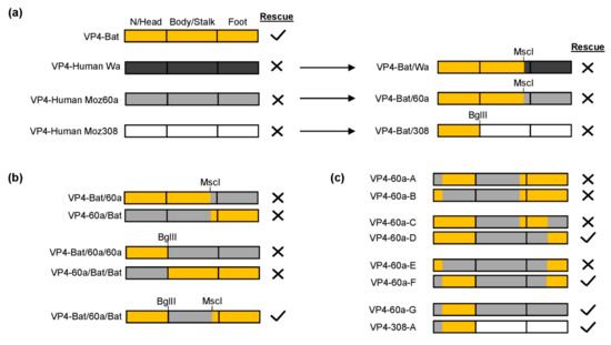 Chimeric bat/human VP4 constructs. N/Head: N-terminus and head region, Bat: orange, human Wa: dark gray, human Moz60a: light gray, human Moz308: white. Successful rescue was confirmed by the presence of a CPE and the detection of viral RNA by qRT-PCR. Negative rescue was confirmed by the absence of a CPE and no detection of viral RNA by qRT-PCR. (a) Chimeric genome segments with nucleotides encoding the head region derived from VP4-Bat and the foot region derived from human strains. (b) VP4-encoding genome segments with sequences from VP4-Bat and VP4-Human Moz60a (c) Genome segments encoding VP4 with different combinations of the N-terminus and foot region.