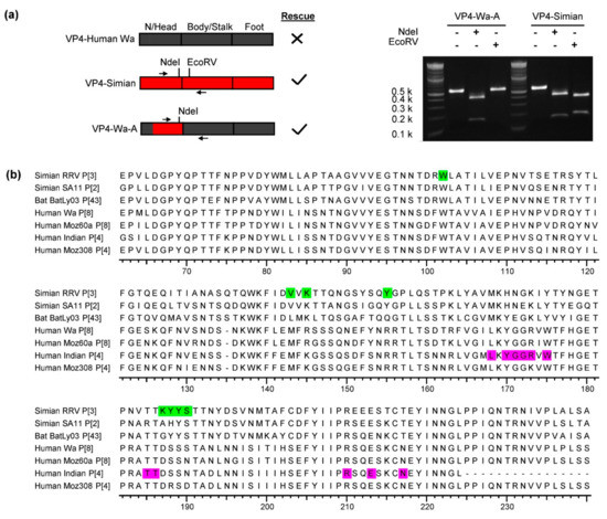 Chimeric simian/human VP4. N/Head: N-terminus and head region, human Wa: dark gray, simian SA11: red. (a) Agarose gel analysis of a restriction enzyme digestion of RT-PCR amplicons from VP4-Wa-A and VP4-Simian. The primer-binding sites and restriction sites are indicated left in the schematic overview of the different constructs. (b) Amino acid sequence alignment of the substituted head region. The sequences of simian RRV and a human Indian strain are included as their glycan-binding site are known. The known glycan-binding sites of simian RRV VP4 [38] and human Indian VP4 [14] are highlighted in green and purple, respectively.