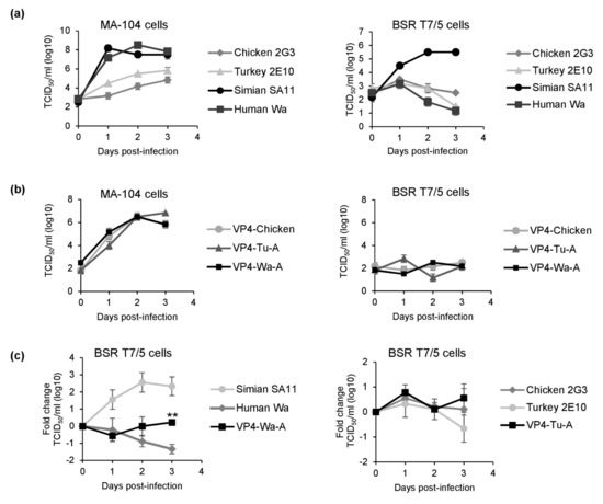 Replication kinetics of the cell culture-adapted parent viruses and their rescued reassortants. MA-104 or BSR-T7/5 cells were infected with 2 × 104 TCID50. The TCID50 was determined in triplicates at the indicated time points. (a) Growth curves of cell-culture adapted viruses. Data are means plus/minus SD (b) Growth curves of reassortants. Data are means plus/minus SD. (c) Comparison of titer changes of parent viruses and reassortants in BSR-T7/5 cells. The TCID50 was normalized to the value from day 0 and the fold change was calculated. TCID50 values at day 0 were: 1.94 log10 for simian SA11, 2.83 log10 for human Wa, 2.17 log10 for VP4-Wa-A, 2.28 log10 for turkey 2E10, 1.94 log10 for chicken 2G3, and 1.72 log10 for VP4-Tu-A. Data are means plus/minus SD from three independent experiments. ** p < 0.01 for human Wa vs. VP4-Wa-A.