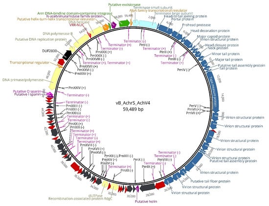 The protein-coding genes in the genome of AchV4 were predicted using Glimmer3 (Geneious Prime v2021.01), and then reviewed manually. Analysis of the genome sequence was performed using BLAST, PSI-BLAST, and Megablast (https://blast.ncbi.nlm.nih.gov/Blast.cgi, accessed on 15 January 2021), ProDom, TIGRFAM, SignalP, TMHMM v2.0, LipoP v1.0, Galaxy [31], as well as HHPred, HHblits, and HHsenser [32]. To search for tRNAs, tRNAscan-SE 1.21 [33] was used, whereas PhagePromoter (Galaxy), ARNold (http://rssf.i2bc.paris-saclay.fr/toolbox/arnold/, accessed on 15 January 2021), and PHACTS [34] were used to predict promoters, rho-independent terminators and the lifestyle of the phage, respectively. Spanin-coding genes were searched for by following the method described in [35].
