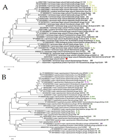Phylogenetic analysis. Neighbor-joining tree analysis based on the ClustalW alignment of: the large terminase subunit (A) and the major capsid protein (B) sequences. The percentage of replicate trees in which the associated taxa clustered together in the bootstrap test (500 replicates) is shown next to the branches. Evolutionary analyses were conducted in MEGA X. US—unclassified siphovirus; UM—unclassified myovirus; UP—unclassified podovirus; S, Sa—Siphoviridae, Sanovirus; S, Chi—Siphoviridae, Chivirus; S, Ahd—Siphoviridae, Ahduovirus; S, Nazg—Siphoviridae; Nazgulvirus; M, Ou—Myoviridae; Ounavirinae; AchV4 is indicated by a red dot.