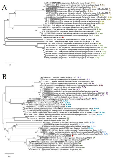 Phylogenetic analysis. Neighbor-joining tree analysis based on the ClustalW alignment of: DNA polymerase (A) and phage endolysin (B) sequences. The percentage of replicate trees in which the associated taxa clustered together in the bootstrap test (500 replicates) is shown next to the branches. Evolutionary analyses were conducted in MEGA X. US—unclassified siphovirus; UM—unclassified myovirus; UP—unclassified podovirus; S, Seu—Siphoviridae, Seuratvirus; S, No—Siphoviridae, Nonagvirus; S, Nip—Siphoviridae, Nipunavirus; S, Kil—Siphoviridae, Kilunavirus; S, Sep—Siphoviridae, Septimatrevirus M, Ota—Myoviridae; Otagovirus; M, Pak—Myoviridae, Pakpunavirus; M, Phi—Myoviridae, Phikzvirus; M, Kis—Myoviridae, Kisquattuordecimvirus; M, Are—Myoviridae, Aresaunavirus; M, Ci—Myoviridae, Citexvirus; M, No—Myoviridae, Noxifervirus; A, Li—Ackermannviridae, Limestonevirus; A, Ag—Ackermannviridae, Agtrevirus; A, Ku—Ackermannviridae, Kuttervirus; A, Ta—Ackermannviridae, Taipeivirus; ND—not determined. AchV4 is indicated by a red dot.