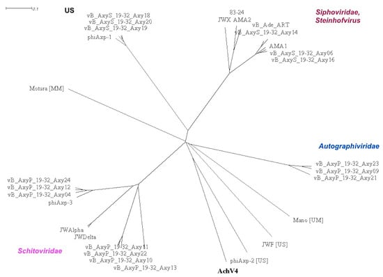 Of note, a very similar clustering was observed (Figure S6) on the tree obtained using the BLAST-based phylogenetics framework VICTOR [39], which grouped 30 Achromobacter phages analyzed into 19 species, 9 genera, and 3 families.