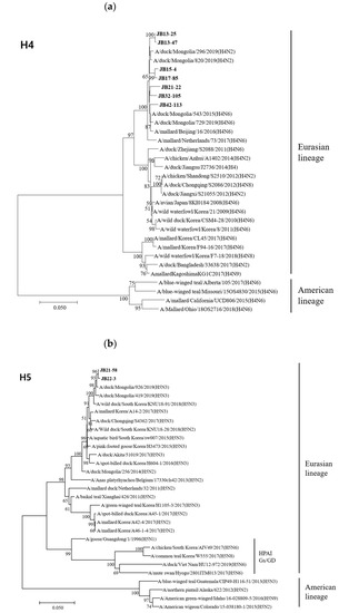 Genome sequences for H4 and H11 subtypes were obtained through Sanger sequencing. Remaining subtypes were obtained through NGS performed by GnCBIO (Daejeon, Korea) using Illumina HiseqX. RNA of the H4 and H11 subtypes was transcribed into cDNA using a cDNA Synthesis kit (Wizbiosolutions, Seongnam, Korea) according to the manufacturer’s instructions. Synthesized cDNA was amplified by polymerase chain reaction (PCR) using primers for the eight viral genomic segments [15,16] (Table 1). Amplicons were purified using the LaboPass™ Gel Extraction Kit (Cosmo Genetech, Daejeon, Korea) and sequenced at Cosmo Genetech (Daejeon, Korea) with an ABI 3730xl DNA analyzer (Applied Biosystems, Foster City, CA, USA). Nucleotide sequences were translated and aligned using the Clustal W algorithm in BioEdit v.7.0.9.0. Phylogenetic trees were constructed by the neighbor-joining method using MEGA 7 software with 1000 bootstrap replications. Reference sequences were downloaded from the NCBI Influenza Virus Resource (https://www.ncbi.nlm.nih.gov/genbank/, accessed on 24 January 2021) and GISAID (http://www.gisaid.org, accessed on 24 January 2021).