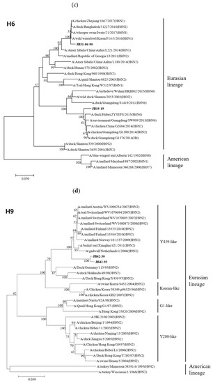 The HA genes of 18 isolates belonged to the Eurasian lineage, but those of the H10 isolates (JB32-15 and JB36-65) belonged to the American lineage (Figure 2). The HA genes of H4, H5, H6, H9, H10, and H11 isolates shared 98.1-99.8%, 99.7%, 83.5%, 99.0%, 99.6%, and 94.2-99.8% nucleotide identities, respectively. The HA genes of H4 and H10 isolates clustered into the same subgroup, despite different NA subtypes. However, the HA genes of H6 and H11 isolates with different NA subtypes showed low similarity and clustered into different subgroups. According to recent study, the HA genes of H5 isolates clustered within the HA-III subgroup, consisting of H5 LPAIVs identified in Korea between 2015-2017 and were genetically distant from H5 HPAIVs [33]. The HA genes of H9 isolates clustered within the Y439-like lineage.