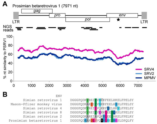 The prosimian retrovirus 1 (PSRV1) genome and its sequence similarity to closely related retroviruses simian retrovirus (SRV) 2, SRV4, and Mason–Pfizer monkey virus (MPMV). (A) PSRV1 encodes four open reading frames: gag, pol, pro, and env. A single premature stop codon was found in the env gene (marked by a star). Initial Illumina next-generation sequencing (NGS) reads mapping to PSRV genome are indicated in black bars below. (B) Sequence alignment of the Env protein shows that the premature stop codon position is otherwise a highly conserved lysine amino acid in other betaretroviruses.