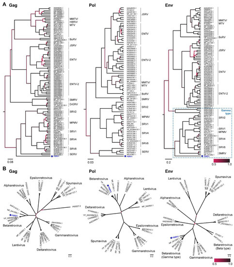 Phylogeny of PSRV1 and closely related retroviruses. (A) Phylogenies generated by Bayesian inference of Gag, Pol, and Env sequence alignments. (B) Phylogenies of Gag, Pol, and Env protein sequence alignments from PSRV1 and representative genome sequences of genera within the Retroviridae family are shown. Scale indicates posterior probability values.