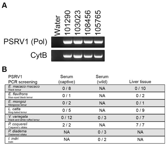 Molecular validation and screening for PSRV1. (A) Gel electrophoresis shows PCR amplification of PSRV1 (pol gene) and host cytochrome B gene (cytB) of nucleic acid extracted from 4 Coquerel’s sifaka liver tissues (IDs: 101290, 103023, 108456 and 105765) and a water negative control. (B) Screening results of a diverse panel of lemur species. Only P. coquereli tested positive for PSRV1 in both sera and liver tissue.