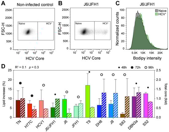 Flow cytometry analysis of early HCV culture infections. Cells infected with different HCV full-length strains were analyzed by flow cytometry at an early infection stage (infection spread ≤ 20%). HCV Core was stained with a mouse anti-Core primary antibody (C7-50, Abcam) and anti-mouse Allophycocyanin (APC)-conjugated secondary antibody; lipid droplets (LDs) were stained using Bodipy 493/505. Graphs show gating of naïve and HCV+ cells for non-infected (A) and J6/JFH1-infected (B) cells selected from one representative experiment out of five independent repeats. The Bodipy median fluorescence intensity (MFI) was then measured on both cell populations (C) and used to calculate the increase in LD signal in infected cells. (D) Comparison of increase in LD content (solid bars) and relative Core amount (hatched bars) in cells infected with different HCV strains. The Core amount is calculated as normalized Core MFI and depicted here as the fold difference from J6/JFH1 (2a). Red shades represent genotype 1a strains, green 2a, blue 2b, brown 2c, and purple 3a. The data presented in D were used to evaluate the linear correlation between LD increase and Core content, resulting in the r-squared and p-value indicated above the graph. Bars represent averages of 2–5 independent measures; error bars represent standard deviation (SD). Circles represent the latest cell harvest time point.