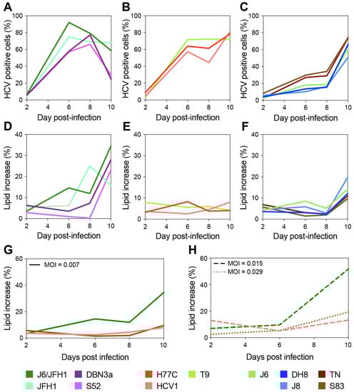 Long-term evaluation of HCV infection spread and LD content increase. Cells infected with different HCV full-length strains were analyzed by flow cytometry every 2–3 days for up to 10 days, and staining was performed as described above (see Figure 1). Cell populations were gated and analyzed as described in Figure 1. A first group of HCV strains showed fast spread (A) and high levels of LD increase (>40%) (D); a second group also displayed fast spread (B) but showed very low accumulation of LD (<10%) (E); a third set showed slow spread (C) and intermediate levels of LD increase (10 to 20%) (F). Three strains, one from each group, were used to assess whether the viral infecting dose had an effect on the observed difference in LD accumulation. Infections with HCV1 (1a), J6/JFH1 (2a), and S83 (2c) were performed at different MOIs (0.007 in panel (G); ≥0.015 in panel (H)) and monitored for up to 10 days as described above. Colors represent different HCV strains; line styles indicate different MOIs.