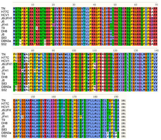 Alignment of amino acid Core sequences from all the analyzed HCV strains. Amino acids are indicated using a single-letter notation. Colors are used to group and distinguish amino acids according to their chemical properties and conservation in the alignment. Different amino acids with the same background color have similar properties; the white background indicates a low conservation. Numbering indicates the amino acid position of Core protein.