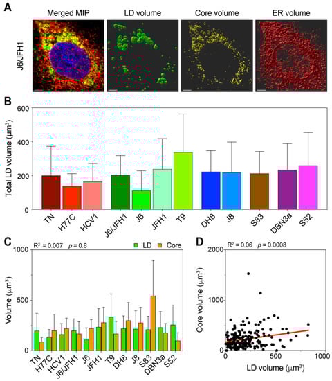To further investigate the nature and extent of LD formation and accumulation in infectious cell-culture systems, we next analyzed LD morphology in infected cells using high-resolution 3D confocal microscopy. Cells infected with the different HCV strains at MOI < 0.1 were fixed and stained 48 h post-infection and imaged. Image stacks were used to reconstruct the cellular three-dimensional morphology and compute volume occupation of LDs, ER, and Core (Figure 4A).