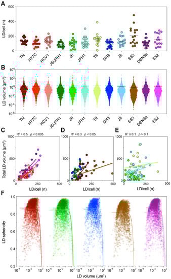 Then, we analyzed the size distribution of individual LD in all cells infected with the same HCV strain (Figure 5B). Similarly, the distribution of LD sizes showed significant differences among HCV strains (p = 0.002, ANOVA). However, it could not directly explain the levels of total LD volume observed earlier. Interestingly, in this analysis J6/JFH1 (2a) and DH8 (2b) had the highest average LD sizes, whereas S83 (2c) had the lowest. Thus, an increase in LD numbers or LD individual size could not directly account for the differences in total LD volume observed in cells infected with the different HCV strains. However, when we compared the number of LDs to their total volume, we could detect distinct patterns in different strains (Figure 5C–E). A first group of strains showed a very good correlation between the LD number and volume (R2 > 0.5), suggesting that in these cases the increase in total LD volume was caused by an increase in the LD number. A second group showed a low but significant correlation (R2 0.3), indicating that the increase in LD number could only partially explain the increase in total volume. Finally, a third group displayed no correlation between the two values (R2 0.1). Interestingly, the strains with the lower correlation values seemed to have either very high numbers or a very high total volume of LD.
