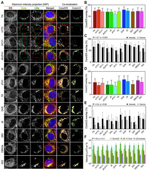 Next, we analyzed the distribution of Core on LDs using the intensity overlap and found significant differences among HCV strains (p < 0.0001; ANOVA) (Figure 6D). Strains of genotype 3a, 2b, and the genotype 2a T9 strain showed the highest co-localization with LDs. A comparison with volumetric co-localization values showed a moderate and significant correlation (R2 = 0.4), confirming that Core localizes on LDs to different extents in different HCV strains during infection in cell-culture (Figure 6E).