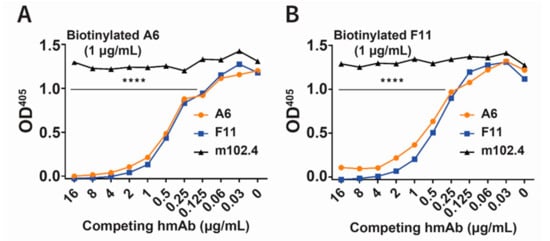 Competitive binding of hmAbs A6 and F11 to ABLVs G. Biotinylated hmAbs (A) A6 and (B) F11 at 1 μg/mL were used in competition ELISAs employing increasing concentrations of unlabeled hmAbs A6 (orange circle) and F11 (blue square) in rVSV-ABLVs-G coated wells. Anti-henipavirus hmAb m102.4 (black triangle) was included as a negative control. The average value from duplicate wells is shown; **** p < 0.0001, two-way ANOVA with Tukey’s multiple comparisons of A6/F11 vs m102.4.