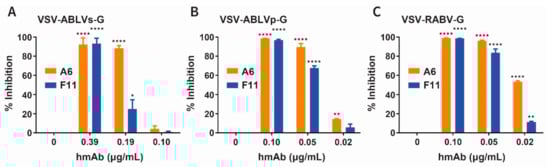 Inhibitory activity of anti-ABLVs G hmAbs A6 and F11 against rVSV-ABLV-G and rVSV-RABV-G infections. HEK239T cells infected with replication-competent recombinant rVSV-GFP viruses expressing (A) ABLVs G, (B) ABLVp G, and (C) RABV G were treated with hmAbs A6 (orange) or F11 (blue). The subsequent percent (%) inhibition was calculated as described in Section 2. Error bars represent the standard error of the mean (SEM); * p = 0.05, ** p = 0.01, **** p < 0.0001, determined by two-way ANOVA with multiple comparisons.