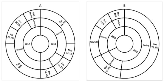 Seasonal distribution of detected SV from 2017 to 2018 (A), and from 2019 to 2020 (B). Inner circle present a year of sample collection; middle circle present seasons of the year; and the outer circle present the SV detection rate per month.