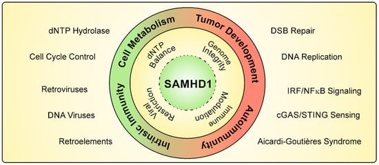 Cellular functions of SAMHD1. The dNTP triphosphohydrolase SAMHD1 is an important regulator of dNTP levels. A correct balance of the cellular dNTP pool has been shown to be important for cell-cycle control and genome integrity. SAMHD1 is a mediator of double-strand break (DSB) repair and ensures the progression of DNA replication. Mutations in the SAMHD1 gene have been identified in various types of cancer. Furthermore, SAMHD1 potently restricts viral infectivity of retroviruses and DNA viruses, and blocks the activity of endogenous retroelements. Mutations in SAMHD1 are correlated with autoimmune diseases such as Aicardi–Goutières syndrome, resulting in elevated type I IFN levels. SAMHD1 also impairs the innate immune sensing of viral infections by interfering with cGAS/STING nucleic acid recognition and NFκB/IRF signaling pathways.