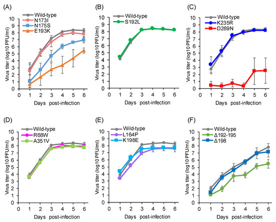 To examine the replicative fitness of the viruses possessing mutations in the antigenic sites (Figure 1), we compared the growth kinetics of the escape mutant viruses in cultured cells with those of their wild-type virus. Using the 12 escape mutants listed in Table 1 and Table 2, we performed growth assays in MDCK cells. Daily virus titers from 1 to 6 dpi were determined by plaque assays with MDCK cells.