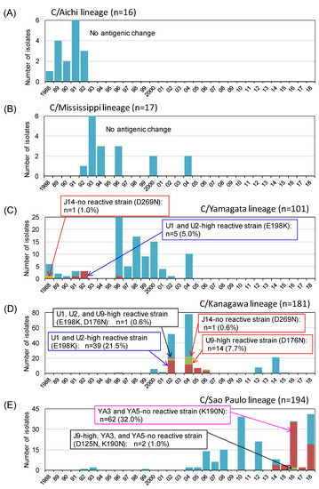 Since 1988, we generated 509 HI test results for the antigenic analysis of influenza C virus isolates in Japan [7,10,11,12,13,14,15,16,17,18,19,31]. The yearly number of isolates belonging to the five HE lineages and the frequency of antigenically different isolates within each lineage are presented in Figure 3.