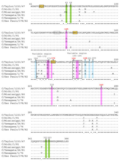Amino acid sequence alignment of the HE globular region (amino acid positions from 41 to 366) of the reference strains belonging to the six HE lineages. The positions of amino acid substitutions that alter antigenicity in natural isolates are indicated by red letters. Colored residues indicate the antigenic sites A-1 (pink), A-2 (green), and A-3 (blue). Boxed residues colored yellow indicate the potential N-glycosylation sites, and noncolored boxed residues indicate a nonutilized sequon NWSP [25,32,33].