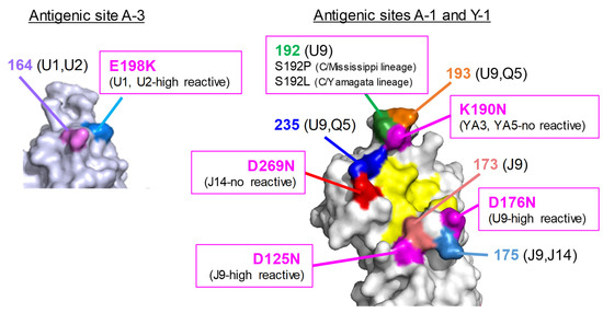 The locations of the amino acid changes that occurred in natural isolates are shown in Figure 5, and the HI titers of the representative antigenic mutants are shown in supplementary Table S2.