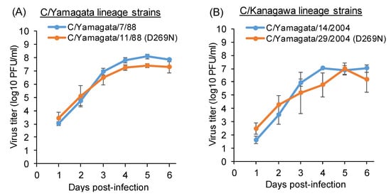 Replication kinetics of natural isolates with or without the D269N mutation among the C/Yamagata lineage strains (A) and C/Kanagawa lineage strains (B). Viral titers are presented as the mean ± SD of three independent experiments.