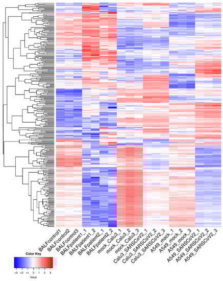 Several sets of raw sequence reads were retrieved from Gene Expression Omnibus (GEO) datasets. GEO dataset GSE147507 contains data from cell lines infected with SARS-CoV-2, including Calu-3 adenocarcinoma cells and A549 cells supplemented with a vector expressing ACE2. GEO dataset GSE139516 contains data from the Calu3 cell line infected with Middle East respiratory syndrome coronavirus (MERS-CoV), while GEO dataset GSE148729 contains data from the Calu3 cell line infected with SARS-CoV-1 and SARS-CoV-2. Raw sequence data from BALF of COVID-19 patients were retrieved from the Genome Sequence Archive (https://bigd.big.ac.cn/, accessed on 2 February 2021), Beijing Institute of Genomics (accession number CRA002390) [28]. RNA-seq data for BALF from healthy control samples were downloaded from the NCBI SRA database (accession numbers SRR10571724, SRR10571730, and SRR10571732). Data from mock-treated cells were provided for each in vitro group (N = 3 per group). The raw reads were retrieved and converted to FASTQ using the SRA toolkit, version 2.10.7.