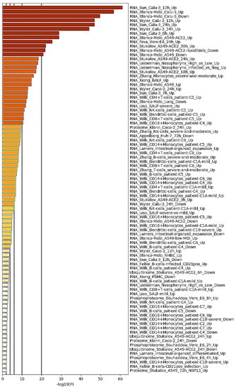Gene set enrichment analysis was next conducted using Coronascape (a specialized version of the Metascape platform (http://coronascape.org, accessed on 2 February 2021)) [37] to reveal expression patterns of the common DE genes identified in transcriptomic data of other available SARS-CoV-2-infected samples. Such analysis showed that a significant proportion of genes and lncRNAs were consistently differentially expressed in COVID-19 patient-derived samples and various SARS-CoV-2-infected cell lines (Figure 2).