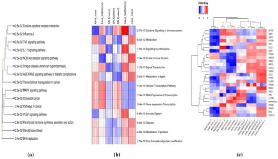 (a) Pathway enrichment analysis of common differentially expressed (DE) genes using the KEGG database. (b) Parametric Gene Set Enrichment Analysis (PGSEA) analysis of common DE genes using the Reactome database. Red and blue indicate activated and suppressed pathways, respectively. (c) Patterns of expression of genes involved in cytokine signaling in the immune system in SARS-CoV-2-infected and control datasets.