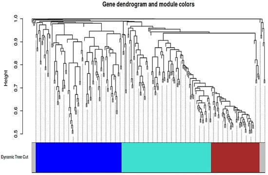 To identify potential lncRNA-mRNA interaction networks among DE genes crucial for cytokine signaling during SARS-CoV-2 infection, co-expression analysis based on WGCNA was performed [32]. Module detection analysis of the common DE datasets consisting of mRNA and lncRNAs was initially conducted. Using WGCNA [32], the soft threshold power of β was 12 when the scale-free topology model fit R2 was maximized. Co-expression modules were then determined by the dynamic tree cut procedure using the dynamic branch-cutting algorithm with a robust measure of interconnectedness, using DynamicTreeCut and the WGCNA R library. A total of three modules were identified in the network, with each module being assigned a unique color label (blue, brown, or turquoise), as represented in Figure 4. In the blue module, four lncRNAs that produce a co-expression network of 105 protein-coding genes were found. In the turquoise module, eight lncRNAs that co-expressed with 104 protein-coding genes were detected. Sixty-three protein-coding genes were found to be co-expressed in the brown module, which did not contain lncRNAs.