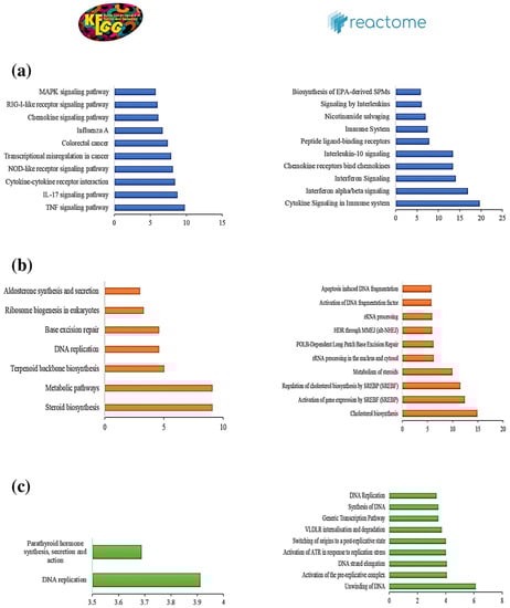 The ten most-highly enriched KEGG and Reactome pathways in the (a) blue, (b) brown, and (c) turquoise modules.
