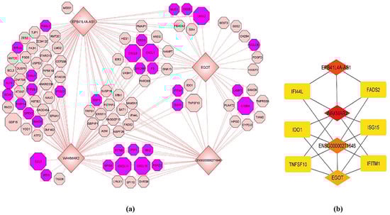 (a) mRNA-lncRNA co-expression network of the blue module. lncRNAs are represented by diamond shapes. The genes highlighted in purple belong to the enriched biological process “response to cytokines.” The genes represented by large octagon shapes represent the enriched KEGG pathway “cytokine-cytokine receptor interaction.” (b) Sub-network of the top ten hub nodes. Increasingly red color represents higher-scoring nodes.