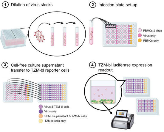 Workflow schematic of the high-throughput parallel replication capacity assay. (1) The virus stocks were added to the dilution tubes and diluted 1–5 times, depending on the TCID50/mL of the stock, in order to reach 2000 TCID50/mL. A total of 16 viruses could be diluted in one dilution box. (2) In quadruplicates, 100 μL of diluted virus was added to wells with 2 × 105 PBMCs (light pink wells) and to wells with only RPMI medium (dark pink wells). In addition, a row of 8 wells containing PBMCs only (no virus) was added as a control (orange wells). (3) Starting three days post infection, 10 μL of cell-free supernatant was transferred from the infection plates to plates containing 2 × 104 TZM-bl reporter cells per well (light purple wells: virus and TZM-bl reporter cells; dark purple wells: virus only; light orange wells: PBMC supernatant and TZM-bl reporter cells; light yellow wells: TZM-bl reporter cells only) at days 3, 4, 5, 6, and 7, post infection. The transfer was made each day starting at the same hour every day. (4) After 24 h incubation (starting at the same hour everyday), in batches of 4 plates per batch, the TZM-bl cells were lysed and the luciferase expression was measured.