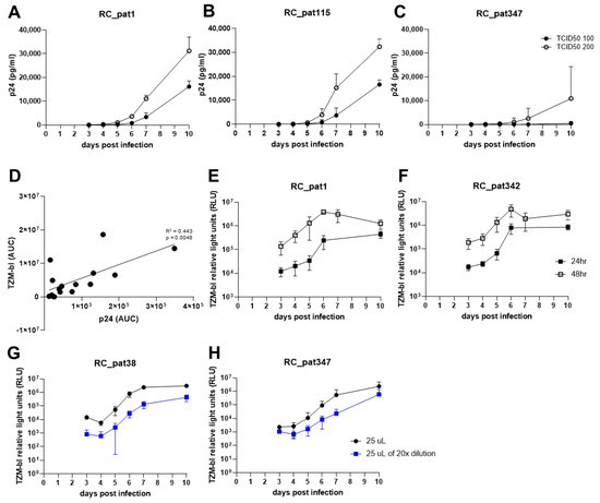 First, we assessed the amount of infectious virus required for multiple rounds of infection. We tested both 100 and 200 TCID50/well of infectious virus input and determined the replication capacity of each virus by quantifying the p24 antigen production and evaluating the replication curves gained over the period of 10 days (Figure 2). The replication kinetics for 100 and 200 TCID50/well were similar (Figure 2A,B). However, for the primary HIV-1 isolates that depicted to be less replication competent, 100 TCID50/well was an inadequate amount of infectious virus to allow for efficient replication (Figure 2C). On the contrary, for the same viruses, 200 TCID50/well exhibited proficient viral replication (Figure 2C). Therefore, 200 TCID50/well was used for all further RC experiments.