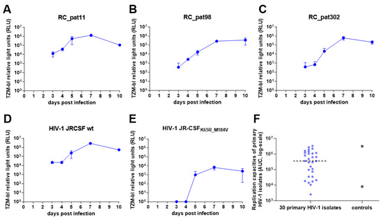 Following these optimization steps, the replication capacity assay was performed using 30 patient HIV-1 primary isolates to test the experimental set-up and optimized conditions of the assay (Figure 3). The replication kinetics display exponential growth over time with a plateau occurring around day 7 (Figure 3A–E). Furthermore, HIV-1 JR-CSFWT replicates at a higher efficiency when compared to the replication kinetics of HIV-1 JR-CSFK65R_M184V (Figure 3D,E). Although the replication kinetics were as expected, from day 7 to day 10, the majority of the RLU values either stayed the same or dropped, which suggests that saturation of virus occurs sometime between day 7 and 10. Therefore, day 10 was excluded from the AUC calculation and from all further experiments. Of note, we evaluated different ways to characterize the replication curve, like slope, RLU at day 7 and AUC. We determined that AUC is more robust by considering the data points from the entire experiment rather than utilizing only a few data points. The replication capacities of the primary HIV-1 isolates exhibited a large distribution from 103–106, with the two control viruses representing the high (HIV-1 JR-CSFWT) and low (HIV-1 JR-CSFK65R_M184V) replication capacities (Figure 3F). Interestingly, one primary HIV-1 isolate had a lower replication capacity than HIV-1 JR-CSFK65R_M184V.