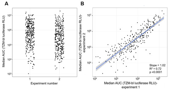 Comparison of replication capacities of 346 primary HIV-1 isolate obtained from two separate experiments. (A) Distribution of the replication capacities (AUC) of 346 primary HIV-1 isolates for each experiment. The x-axis denotes the experiment from which the AUC values were measured. The y-axis depicts the replication capacities of the primary HIV-1 isolates represented as AUC values. (B) Scatterplot comparison of AUC values obtained from two separate experiments. The x-axis represents the values for the first experiment and the y-axis represent the values for the second experiment. Both axes are in log scale. An OLS regression line is shown (blue line) with its standard error band (gray shaded area).