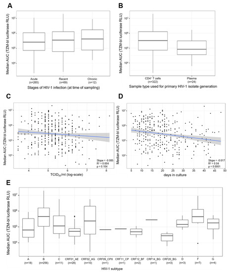 Comparisons of primary HIV-1 isolate replication capacities to stages of infection, types of samples used for generation of primary HIV-1 isolates, viral titers of virus stocks, days in culture, and HIV-1 subtypes. (A) Comparison of replication capacities of primary HIV-1 isolates for the different stages of HIV-1 infection. The x-axis represents the three stages of infection: acute, recent, and chronic, and the number (n) of primary HIV-1 isolates in each stage of infection. The y-axis represents the median AUC values of the replication capacities in log scale. The Wilcoxon signed-rank test was performed for comparisons between two groups and the Kruskal–Wallis test was performed for comparisons of more than two groups. (B) Comparison of the replication capacities of primary HIV-1 isolates derived from CD4+ T cells or plasma. The x-axis depicts the 2 types of samples used to generate the primary HIV-1 isolates, and the number (n) of primary HIV-1 isolates derived from the corresponding sample type. The y-axis represents the median AUC values of the replication capacities of the primary HIV-1 isolates. (C) Comparison of the viral titers of the primary HIV-1 isolate stocks to the corresponding replication capacities. The x-axis represents the tissue culture infectious dose of 50% per ml in log-scale. The y-axis depicts the median AUC values of the replication capacities for the primary HIV-1 isolates. (D) Comparison of the number of days the T/F primary isolates were in culture on the x-axis against the median AUC values of the replication capacity of the viruses on the y-axis, in log scale. The graph shows the OLS regression results (blue line) and its standard error (gray shading). (E) Comparison of the distribution of the replication capacity for different HIV-1 subtypes. The x-axis represents the various HIV-1 subtypes and the number (n) of each subtype. The y-axis depicts the replication capacities of T/F viruses represented as median AUC values. The black dots represent outliers, identified as values that are more than 1.5 times the interquartile range removed from the first or third quartile. The Kruskal Wallis test was performed to compare the median AUC values among the different HIV-1 subtypes.
