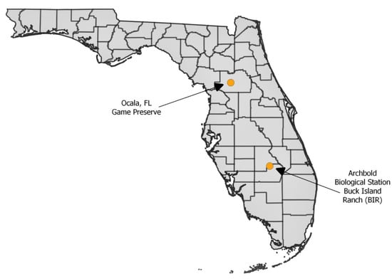 Culicoides insignis females used for this study were collected from two sites in the Florida peninsula. The two sites were: (a) Archbold Biological Station’s Buck Island Ranch (BIR), which is located south of Lake Placid (Highlands County) and is a research rangeland for investigating the relationships between cattle ranching, citrus production and Florida native ecosystems, and (b) a privately owned deer farm near Ocala (Marion County) (Figure 1). Biting midges were collected using Centers for Disease Control and Prevention (CDC) miniature light traps (Model 2836BQ, BioQuip Inc., Rancho Dominguez, CA, USA) with LED black light arrays (model 2790V390, BioQuip Inc.) that were baited with CO2 (dry ice). The traps were modified with mesh (standard nylon window screen) at the intake to exclude larger arthropods. A BugDorm insect cage (Model #4F2222, BugDorm, Taiwan) was used as the collection net to increase survival of trapped insects [33]. Due to low blood-feeding rates, multiple collections had to be made for each infection trial. Collections were made on select nights between 11 and 17 July 2018 at the BIR site and between 12 and 26 September 2018 at the Ocala site. Traps were retrieved in the morning and returned to the Florida Medical Entomology Laboratory where midges were aspirated into 16oz paperboard cups and placed into an incubator (Thermo Fisher Scientific, Waltham, MA, USA) at 25 °C, 80% humidity, and 14:10 light:dark (L:D) photoperiod. Prior to blood-feeding, which was conducted within 2 h of arrival at the laboratory, midges were only provided with water.