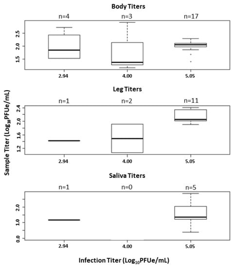Viral titer data for body samples were determined to be normally distributed (p = 0.19), permitting the use of one-way ANOVA. ANOVA results indicated no significant difference in viral titer in body samples between infection titers (F1,22 = 0.07, p = 0.79). Leg and saliva titers were not compared between infection titers due to low dissemination and transmission rates in medium and low titer trials.