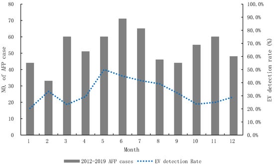 The temporal distribution of AFP showed random distribution throughout the year with 53 cases/month (range 33–71 cases/month). The NPEV detection rate of AFP was from 20.5% to 50.0%, and the highest at 50.0% occurred in May (Figure 1).